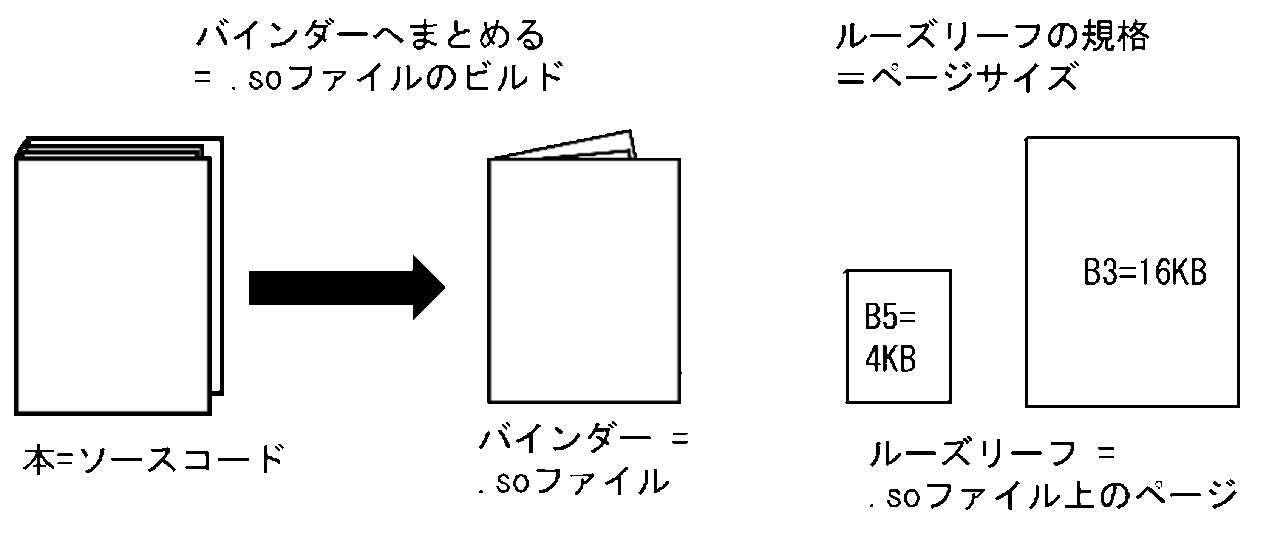 [A]1冊の本と同じ内容を、B5またはB3のルーズリーフへ転記してバインダーにまとめたとします(図1)。この操作はソースコードから、メモリマッピング時のページ単位を決めて.soファイルをビルドする操作と似ています。