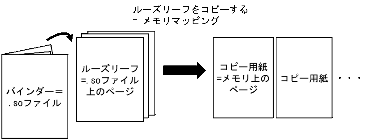 [B]このルーズリーフの何枚かを、印刷機でB5またはB3のコピー用紙へ1枚ずつコピーする行為は、.soファイルを4KBまたは16KBのメモリへページサイズを基準にマッピングする操作に似ています(図2)。