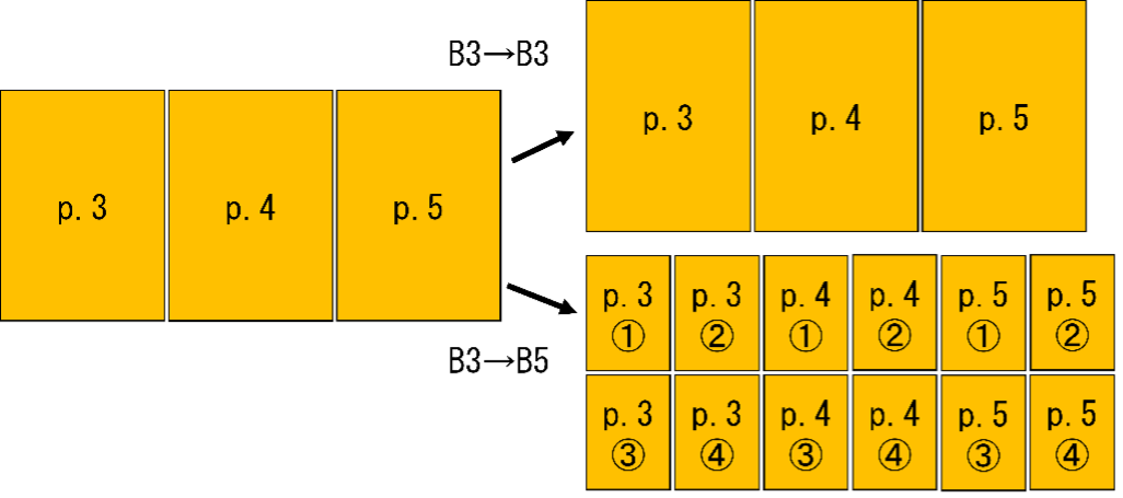 B3のルーズリーフをコピーした場合は図3のようになります。B3からB3は同じ規格で余白なくそのままコピーできます。B3からB5では、1枚に入りきらないため、B3の1枚につき、B5の4枚に分割して合計12枚へ、同様に余白なくコピーできます。
