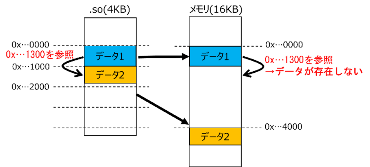 (d)の余白は、ルーズリーフのコピーでは違和感だけで済みますが、.soファイルのメモリマッピングにおける余白はプログラム構造の破綻と同義です。図5のように余白により期待した位置にデータがないことでデータ間の参照が崩れ、プログラムは適切に動作しなくなります。