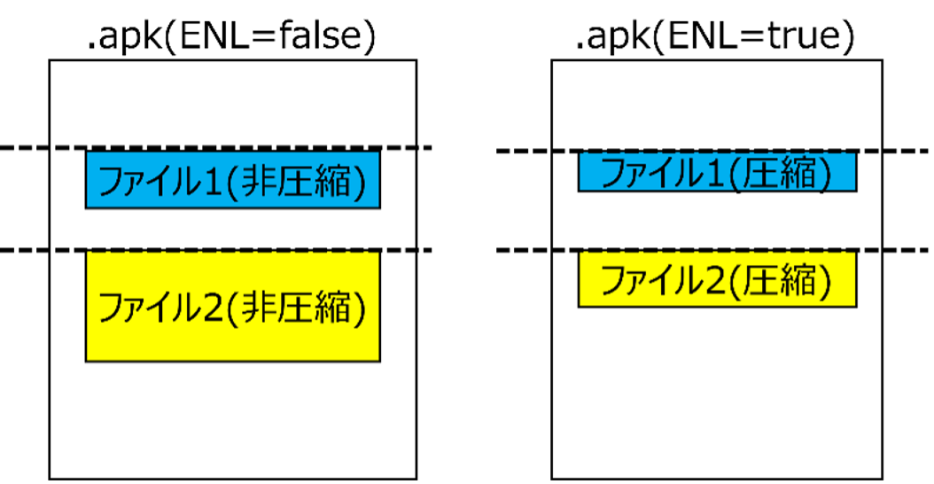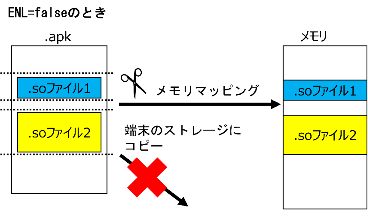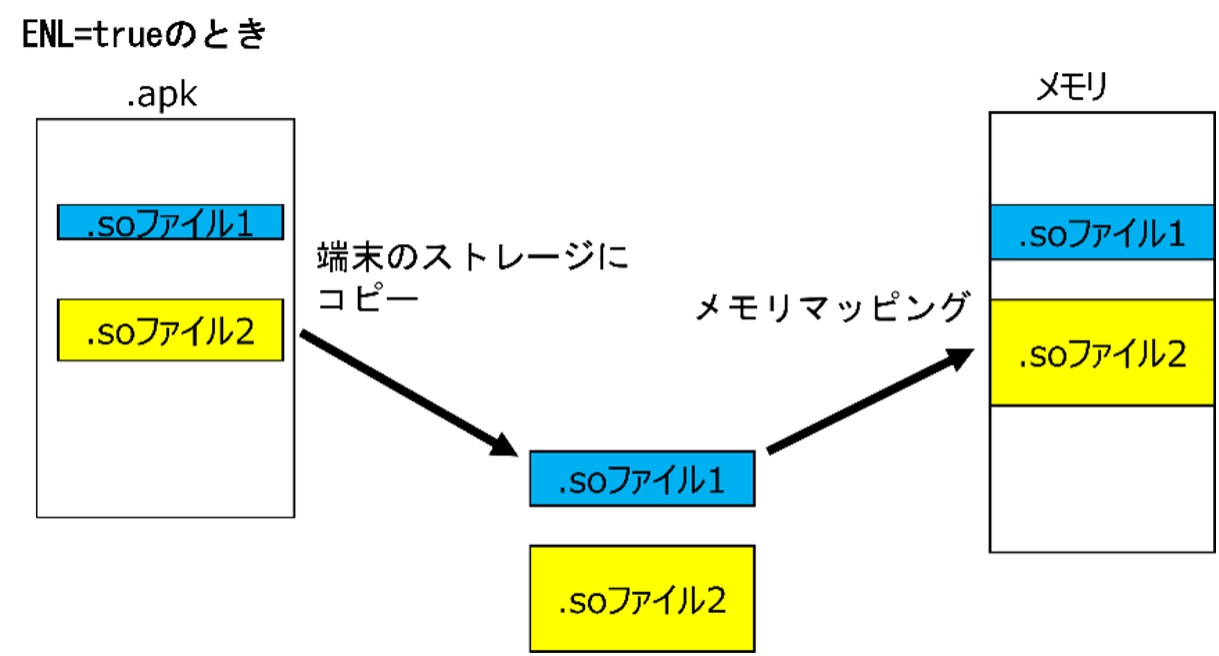 アプリのAndroidManifest.xml属性のextractNativeLibs(ENL)が”false”のとき、