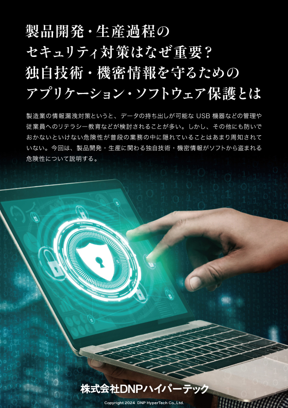 製造業においてアプリを事業に活用する際、そのアプリを不正に解析され、企業の独自技術が盗まれたり、企業が許可しない機能を追加されたアプリが作られて流通するなど、さまざまな被害が想定されます。そして、その危険性は、いまだ十分に周知されているとは言えない状況です。DNPハイパーテックは、今後も製造業界のアプリセキュリティについての情報発信を続けていきます。