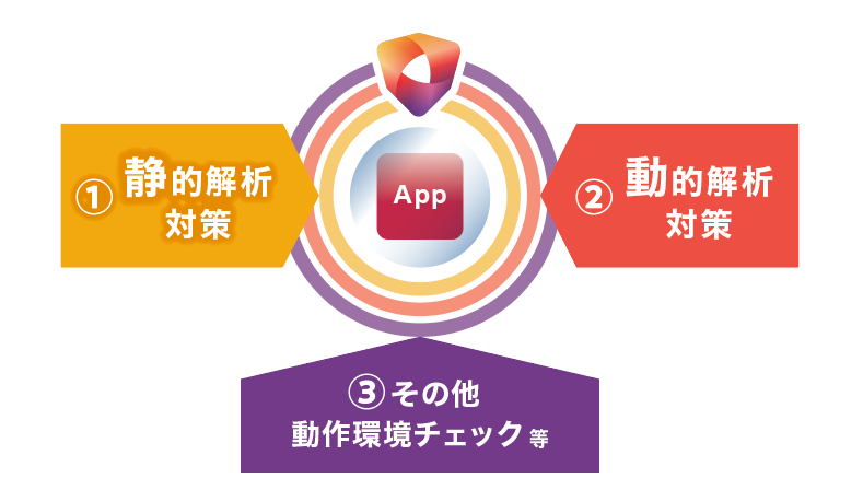 攻撃者に静的解析・改ざん(アプリを動作させず、アプリそのものを解析して、プログラムを改ざんする行為)されるケースを想定し、事前に難読化等の対策を行っていても、動的解析・改ざん(アプリを実行している状態で、攻撃者が端末のメモリ情報などを対象に解析・改ざんする行為)への対策がされていないと、守りたい情報が攻撃者に解析・改ざんされてしまいます。また、攻撃者は動的解析・改ざんを行うために、特権を取得したOSやエミュレータなど、通常とは異なる環境でアプリを動作させようとしてくるため、そのような不正環境上でのアプリ実行についても、しっかり対策を行っておくべきです。